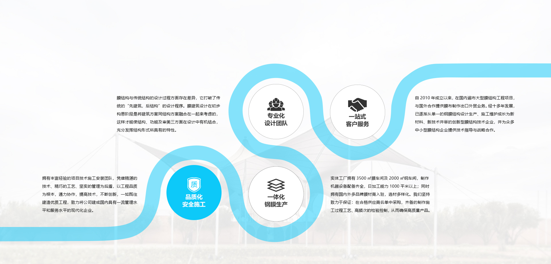 上海示一膜結(jié)構(gòu)有限公司是一家專(zhuān)業(yè)從事膜結(jié)構(gòu)工程的設(shè)計(jì)開(kāi)發(fā)、加工制造、施工安裝、維護(hù)咨詢(xún)于一體的實(shí)體化服務(wù)型企業(yè)。公司擁有先進(jìn)的膜加工設(shè)備及檢驗(yàn),測(cè)試設(shè)備,并擁有國(guó)際先進(jìn)的膜結(jié)構(gòu)設(shè)計(jì)軟件,是國(guó)內(nèi)頗具規(guī)模的專(zhuān)業(yè)性膜結(jié)構(gòu)公司之一。公司注冊(cè)于2010年,現(xiàn)注冊(cè)資金為3620萬(wàn)元,擁有從事膜結(jié)構(gòu)建筑行業(yè)的工程技術(shù)及制作安裝的高素質(zhì)人才,是獲得膜結(jié)構(gòu)專(zhuān)項(xiàng)設(shè)計(jì)、專(zhuān)項(xiàng)制作、專(zhuān)項(xiàng)安裝貳級(jí)和鋼結(jié)構(gòu)專(zhuān)業(yè)承包三級(jí)資質(zhì)、ISO9001、安全生產(chǎn)許可證、商標(biāo)證等資質(zhì)證書(shū)的專(zhuān)業(yè)膜結(jié)構(gòu)公司。