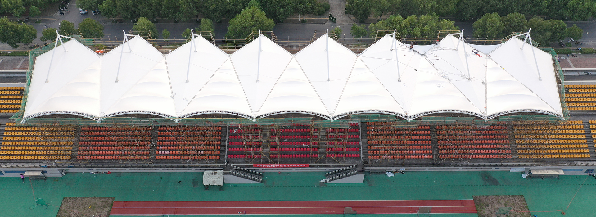 位于安徽六安技術(shù)學(xué)院的帽頂式膜結(jié)構(gòu)看臺(tái),面積1200平方米,采用PVDF膜材。膜結(jié)構(gòu)看臺(tái)造型美觀(guān)大方,空間跨度大,自重輕,施工周期短,使用年限時(shí)間長(zhǎng)等。而高透光及折射性質(zhì),營(yíng)造了自然明亮的感覺(jué)。
