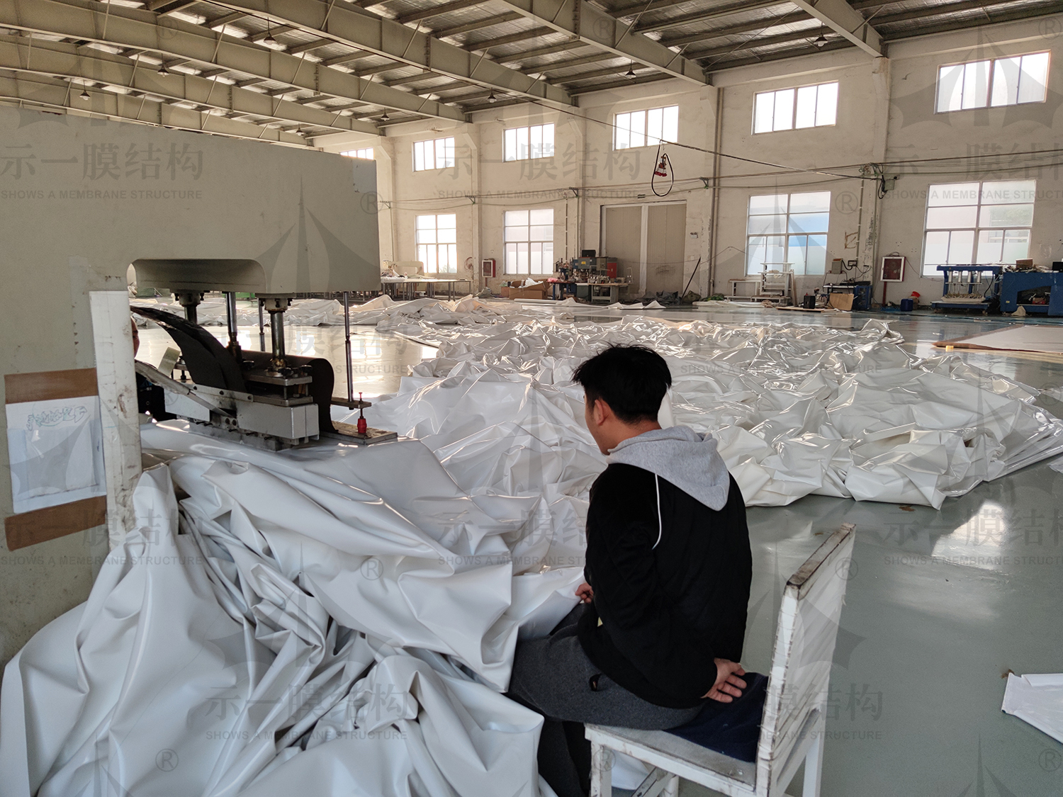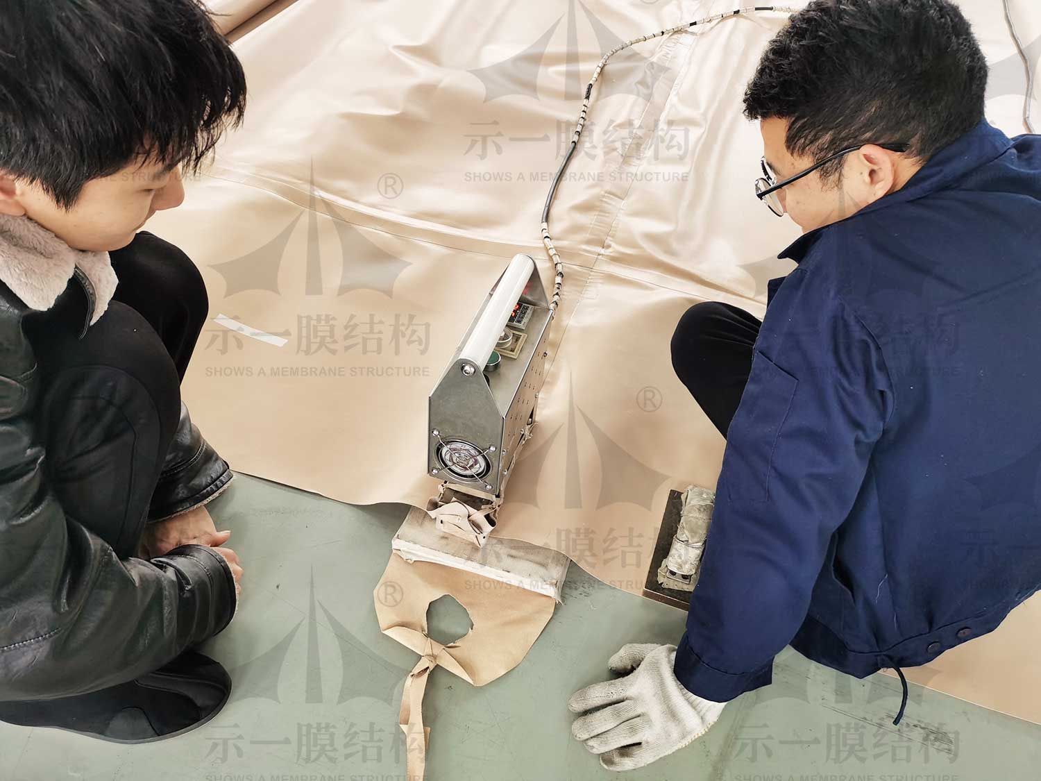 熱焊接是加熱粘合縫,并使織物上層的涂層熔融,然后施加壓力并使粘合縫冷卻??梢酝ㄟ^向膜材吹熱空氣,或者讓膜材接觸加熱物件,或者通過高頻電磁波,使得膜材獲得相應(yīng)的熱量。 熱和粘合使用于PVC涂覆聚酯長絲織物和PTFE涂覆玻璃纖維織物。而對于PTFE涂覆玻璃纖維織物來說,由于PTFE不能自己熱熔,就需要在內(nèi)層采用一種不同的材料。