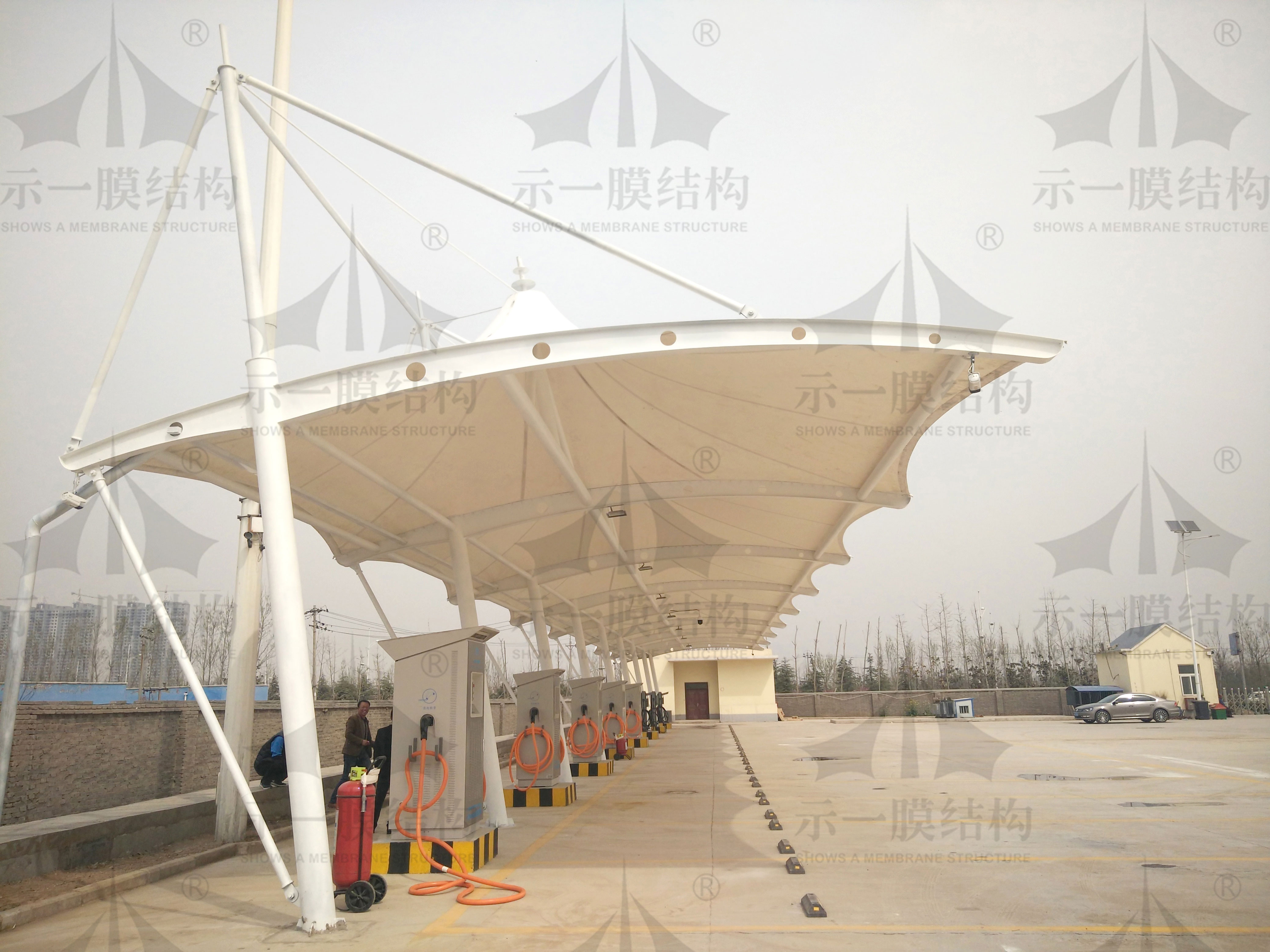 膜結(jié)構(gòu)車棚是一種流行趨勢。首先帶來的一種便捷,還有帶來的一種安全感。充電樁