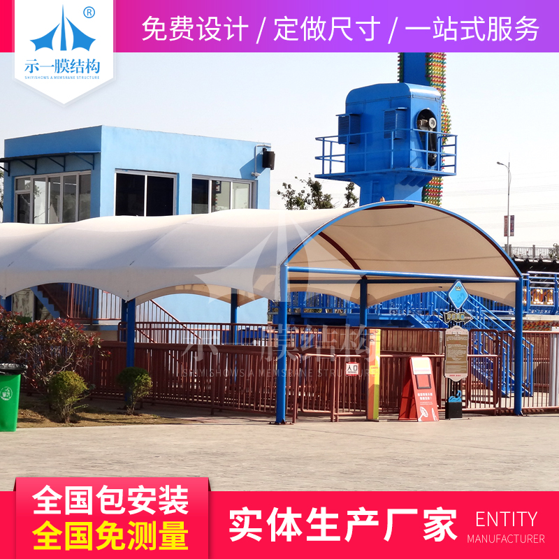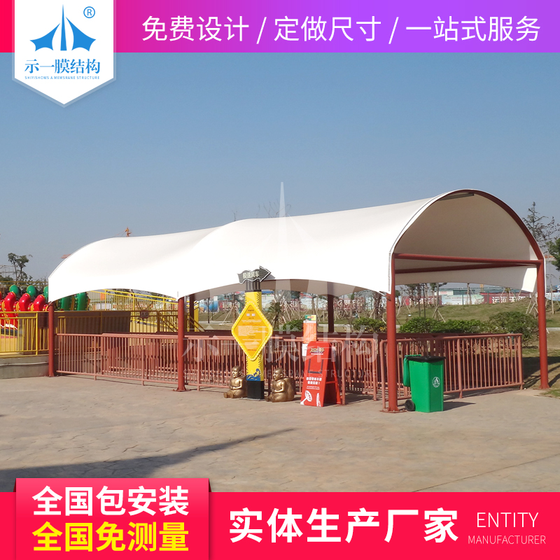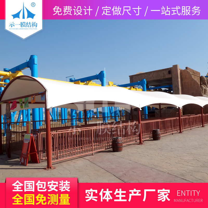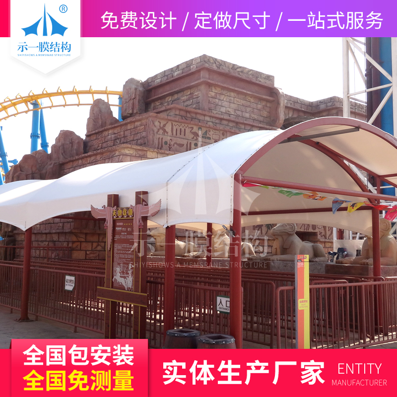 夏季比雨水更煩的肯定是高溫,太陽(yáng)直曬真的傷不起,不僅會(huì)曬黑,重點(diǎn)是曬傷啊,所以暑假季出門(mén)游玩,最怕就是景點(diǎn)排隊(duì)的時(shí)刻,人多的話真不是一項(xiàng)好活啊,如果這時(shí)候有一個(gè)等候點(diǎn)的膜結(jié)構(gòu)遮陽(yáng)雨棚,是不是就好了很多,起碼能解放撐傘的手打個(gè)扇子或者喝下水,不行還能來(lái)個(gè)自拍,發(fā)個(gè)微信求安慰。。。不知道你有沒(méi)有去過(guò)宿遷克拉嗨谷,那里就有好幾個(gè)由上海示一膜結(jié)構(gòu)承接的等候區(qū)膜結(jié)構(gòu)遮陽(yáng)雨棚,上個(gè)圖先看看。