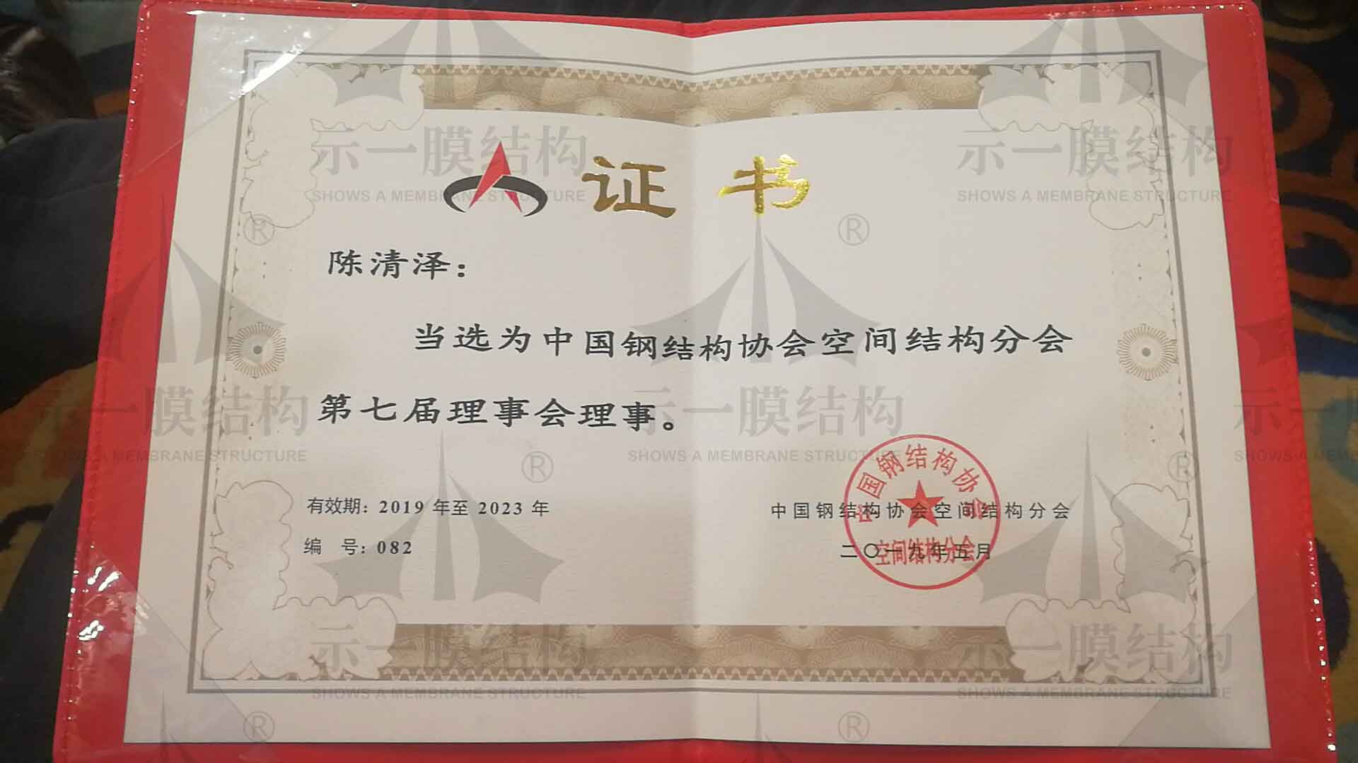 還有一件值得高興的事小編想和大家一起分享。那就是我們上海示一膜結(jié)構(gòu)有限公司陳清澤先生被當(dāng)選為中國(guó)鋼結(jié)構(gòu)協(xié)會(huì)空間結(jié)構(gòu)分會(huì)第七屆理事會(huì)理事并頒發(fā)了榮譽(yù)證書(shū)。