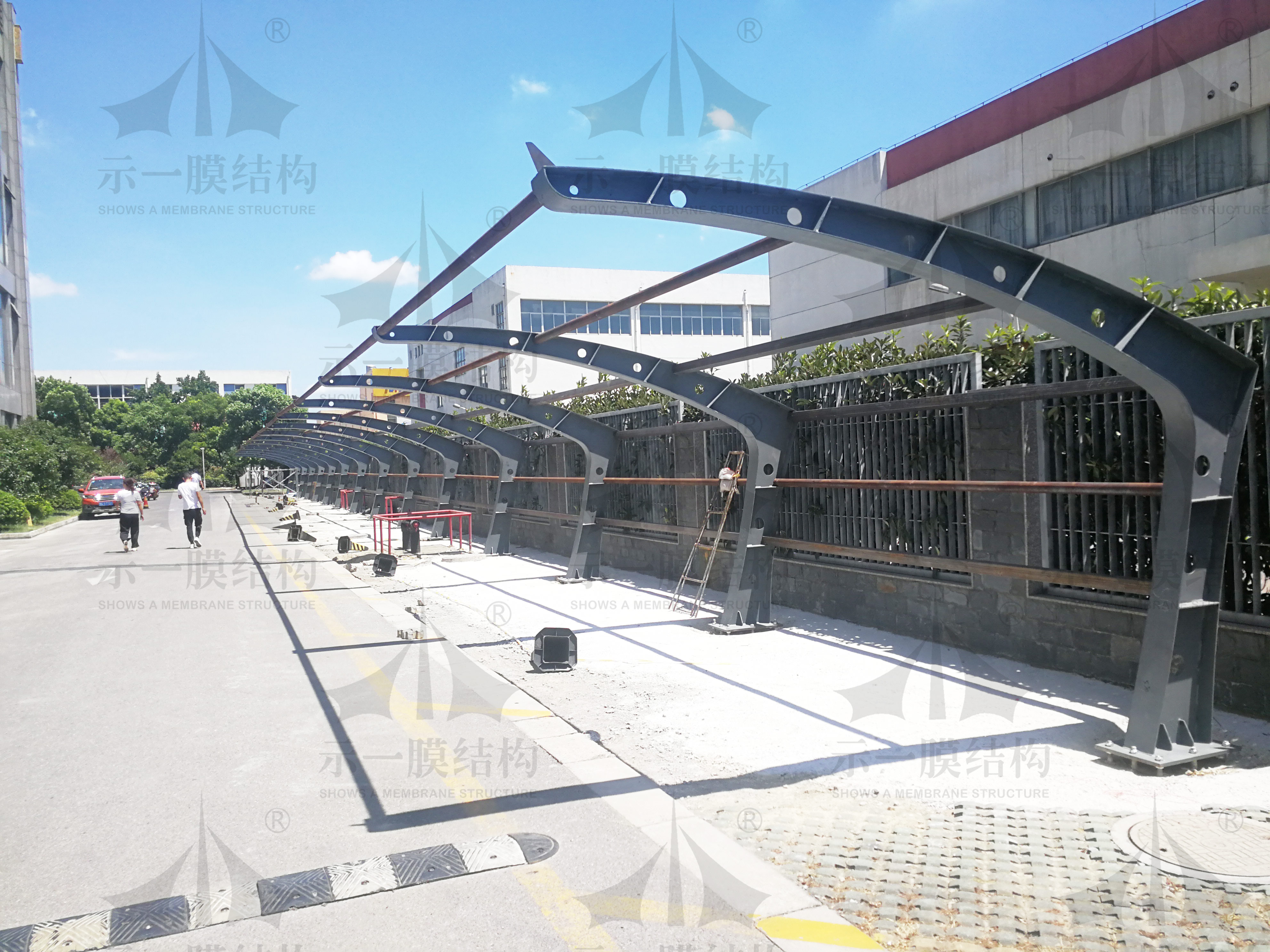 上海示一膜結(jié)構(gòu)有限公司近期在蘇州制作了一個膜結(jié)構(gòu)停車棚,工程已經(jīng)完工。我們都知道膜結(jié)構(gòu)停車棚的在造型也是多樣化的,有立柱的,有雙挑的,有七字型的等等,膜結(jié)構(gòu)停車棚也是有靈魂的,還可以根據(jù)客戶的不同要求設(shè)計。我們這次制作的膜結(jié)構(gòu)停車棚就是其中的一種叫做七字型膜結(jié)構(gòu)停車棚,不難從字面意思理解,造型像個中文七字,是以鋼結(jié)構(gòu)為基礎(chǔ)搭配PVC膜材組合而成。