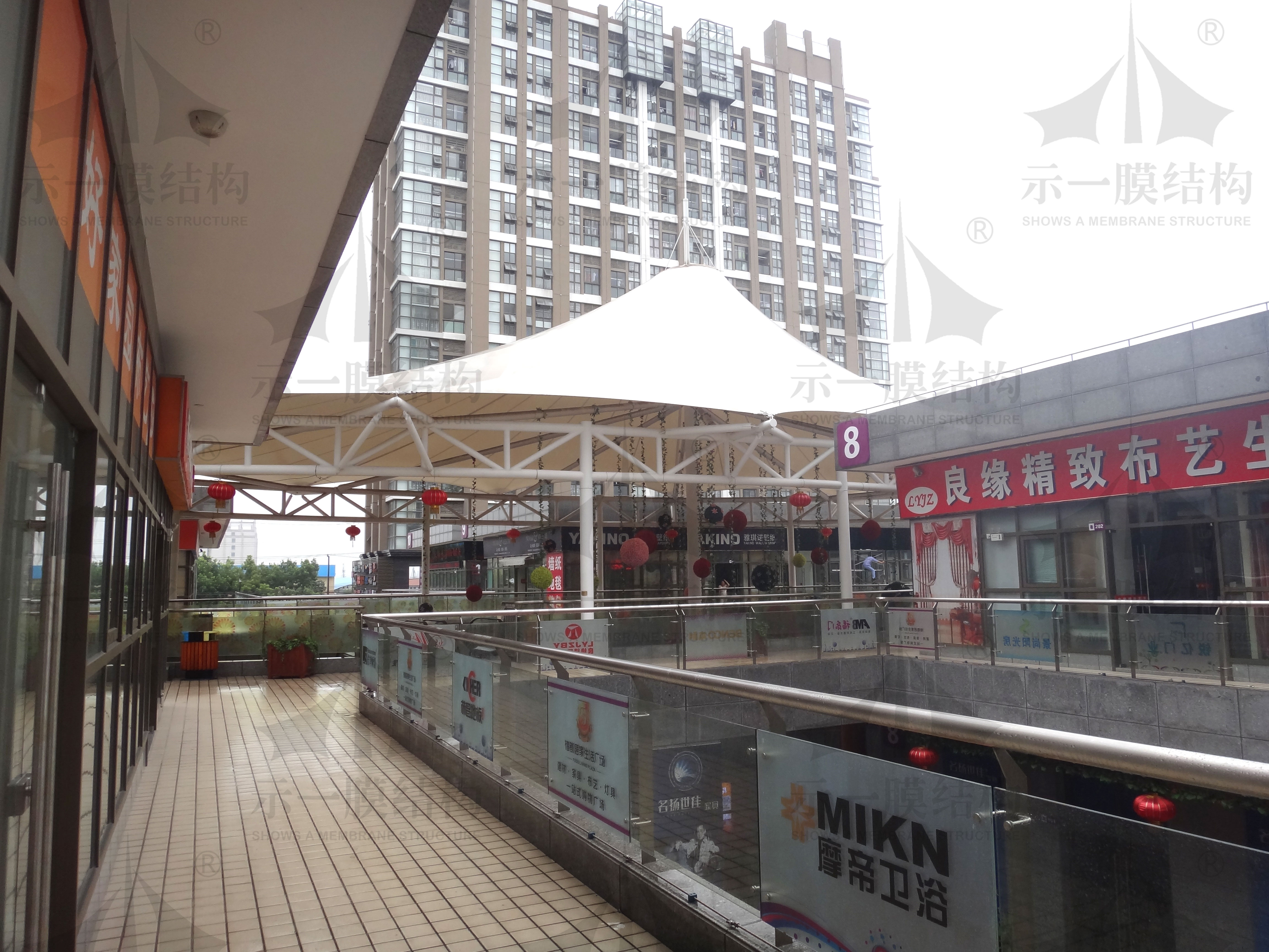 商業(yè)街在城市中占有相當大的比重。商業(yè)街的建筑與環(huán)境是城市文明的窗口,代表著物質(zhì)文明和精神文明的水平,同時也是景觀環(huán)境的重要組成部分。膜結(jié)構(gòu)輕盈特別極具現(xiàn)代化風(fēng)格,且體現(xiàn)方式多樣易于安裝移動,在商業(yè)街規(guī)劃中得以廣泛應(yīng)用。