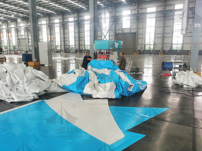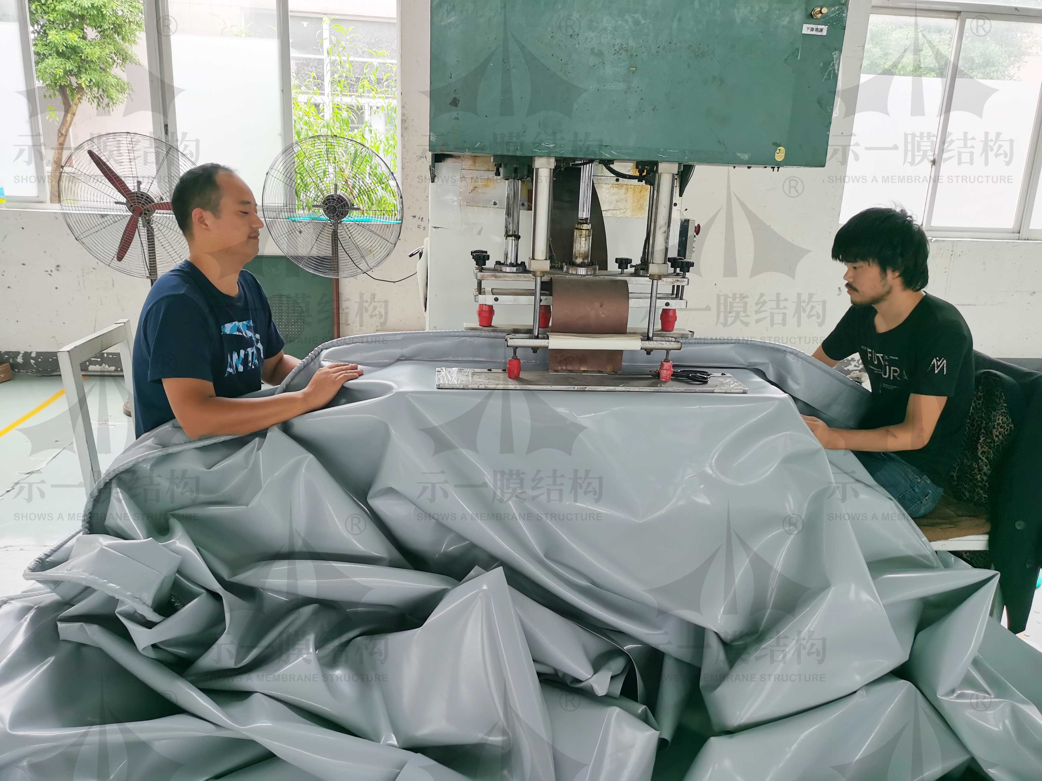 熱焊接是加熱粘合縫,并使織物上層的涂層熔融,然后施加壓力并使粘合縫冷卻??梢酝ㄟ^向膜材吹熱空氣,或者讓膜材接觸加熱物件,或者通過高頻電磁波,使得膜材獲得相應的熱量。 熱和粘合使用于PVC涂覆聚酯長絲織物和PTFE涂覆玻璃纖維織物。而對于PTFE涂覆玻璃纖維織物來說,由于PTFE不能自己熱熔,就需要在內層采用一種不同的材料。