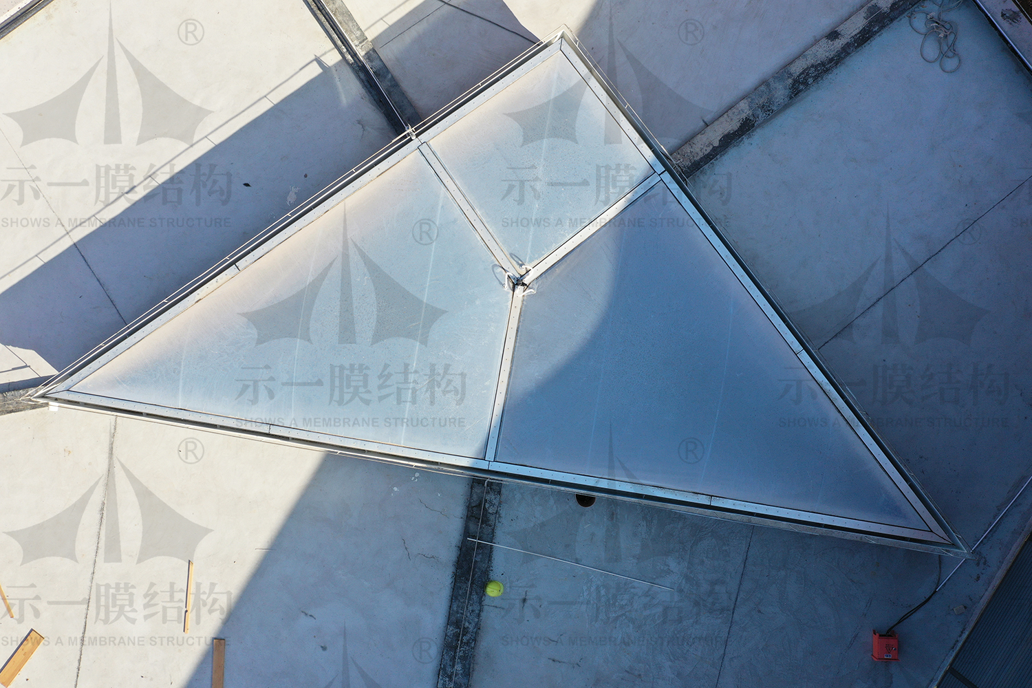 膜結(jié)構(gòu)的安裝次序,總體是先安裝面積大的區(qū)域,再根據(jù)現(xiàn)場及鋼結(jié)構(gòu)作業(yè)面的交付情 況安裝相應(yīng)相鄰區(qū);采用從中間往兩邊,從高到低的順序來安裝,按區(qū)域進行安裝、同時至少保證 3 組人員開工,主要采用吊車的方式,把 ETFE 膜材料加工完成的成品箱吊裝至網(wǎng)架結(jié)構(gòu)上表面、通過二次轉(zhuǎn)運,按中間向兩邊的順序一組的安裝,安裝的同時布置管線,每個 分片區(qū)域全部安裝完成后,進行調(diào)試充氣,循環(huán)進行,直到膜結(jié)構(gòu)工程完成。