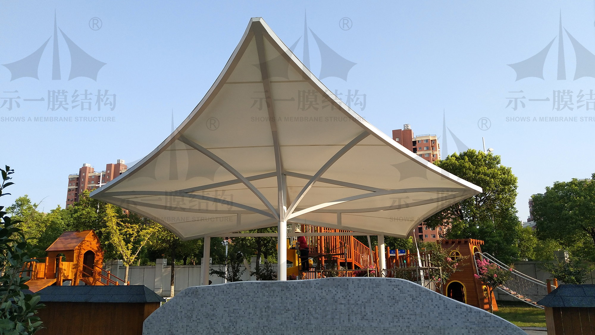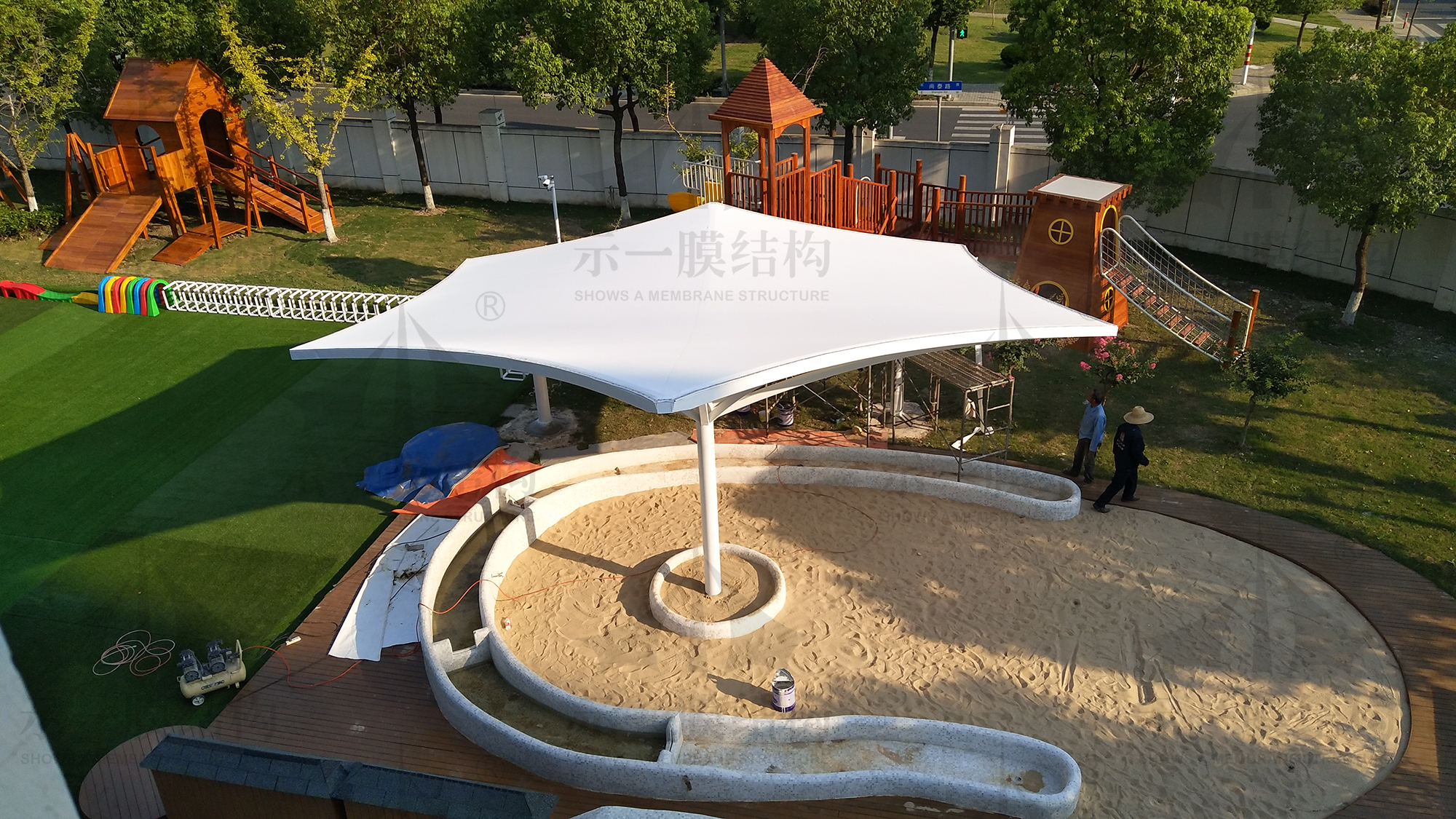 校園沙坑上搭建的景觀膜結(jié)構(gòu)遮陽棚,配以冒頂遮陽張拉膜形式組合而成,堪稱完美組合。
