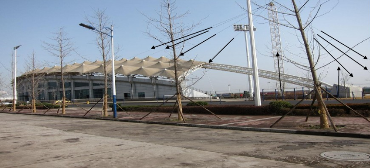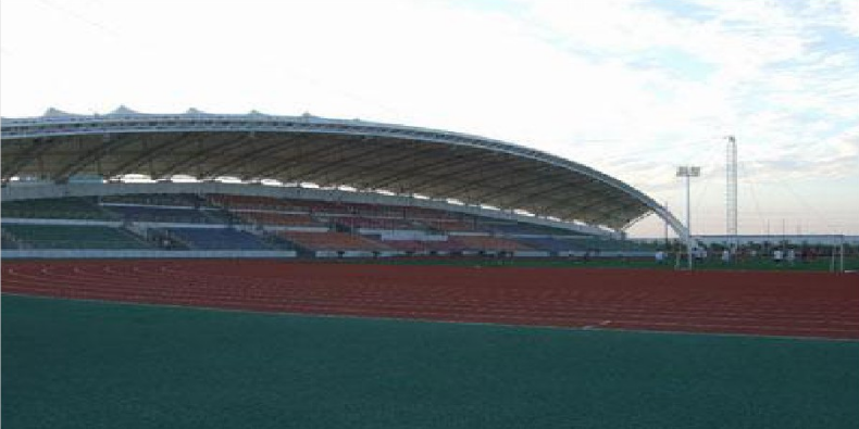 長安大學(xué)渭水校區(qū)體育場位于西安市。該工程為一骨架支撐式膜結(jié)構(gòu),由主拱、塔柱、平面桁架和拉索共同形成受力體系。主拱跨度為210米,曲率半徑235米。兩側(cè)塔柱建筑高度約35米,塔柱通過3根拉地索和4根連接主拱的拉索平衡。