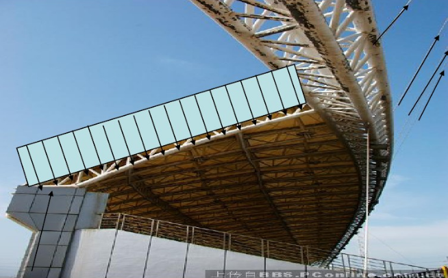 在看臺邊沿另設(shè)置兩根拉地索,增強(qiáng)主拱的整體穩(wěn)定性。膜結(jié)構(gòu)建筑面積約為4000平方米,利用下部混凝土結(jié)構(gòu)柱作為后支座,在主拱和混凝土柱之間用縱橫兩方向平面桁架連接形成57個方塊。每個方塊為一個單元膜體,中間采用飛柱,形成錐形膜單元群。57個膜體方塊帽頂在空間形成3道弧線,完美表達(dá)體育建筑“力與美”的設(shè)計初衷。