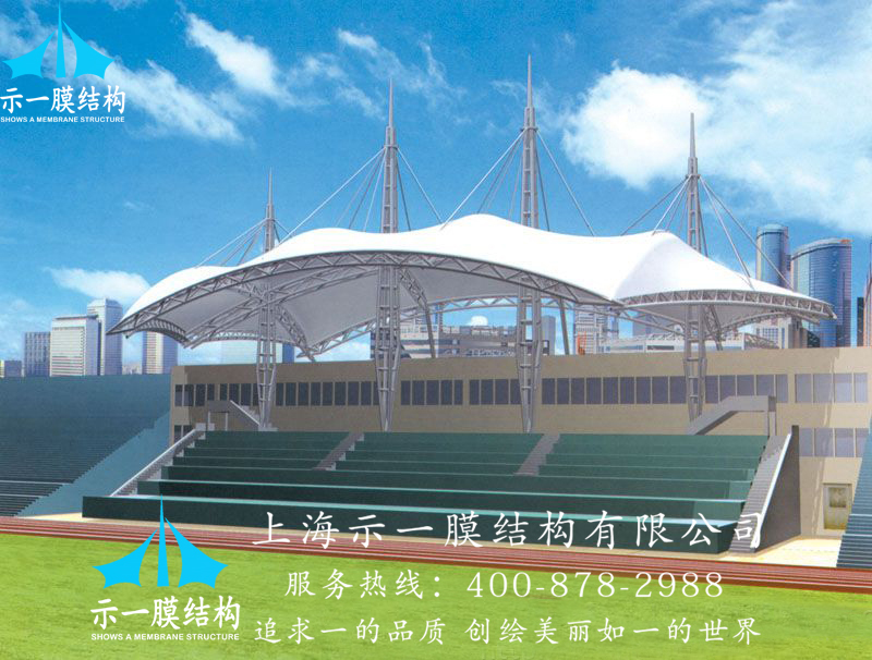 膜結(jié)構(gòu)看臺(tái)適用于學(xué)校操場(chǎng)看臺(tái)或主席臺(tái)、體育館大跨度看臺(tái)等場(chǎng)所,膜結(jié)構(gòu)看臺(tái)自重輕、空間跨度大,施工安全快捷,使用年限長,與傳統(tǒng)混凝土看臺(tái)相比優(yōu)點(diǎn)凸顯。