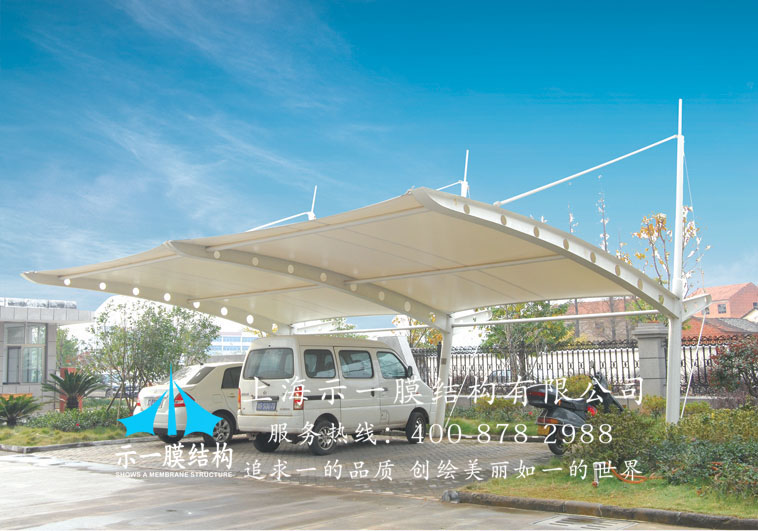 膜結(jié)構(gòu)車棚遮陽棚適用于小汽車、自行車或電動(dòng)車、公交車停車場(chǎng)等,款式新穎,造型美觀,經(jīng)濟(jì)適用。膜結(jié)構(gòu)車棚的設(shè)計(jì)技術(shù)越來越先進(jìn),膜結(jié)構(gòu)材料具有連接可靠、施工方便等特點(diǎn),最關(guān)鍵的是膜材具有足夠的強(qiáng)度和優(yōu)異的力學(xué)性能以及抗老化、耐熱、耐腐蝕等性能,確保車輛在炎炎夏日不會(huì)受到烈日侵襲。