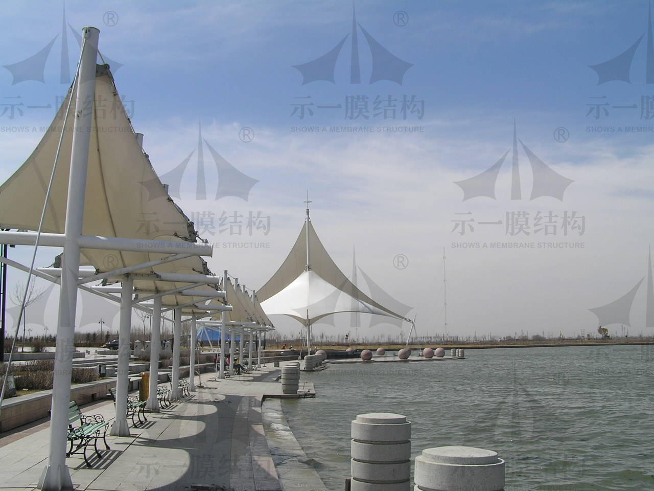 膜結(jié)構(gòu)的膜材都是柔性材質(zhì),要通過鋼結(jié)構(gòu)和拉索來提供形態(tài)曲面,就需要有一定的張拉力,在膜材與金屬件直接連接時,張拉膜,最怕尖刺和太過粗糙的固定點,張拉力的不均衡也極易造成膜材受損。金屬和膜材的連接部位要保證光滑,并且切實做好防腐防銹處理,膜材對任何缺陷都比較敏感,從制作到運輸?shù)桨惭b過程中,都要保護(hù)好膜材,膜結(jié)構(gòu)車棚,若出現(xiàn)小孔、裂紋等缺陷,膜材的強度和使用壽命將有較大降低。