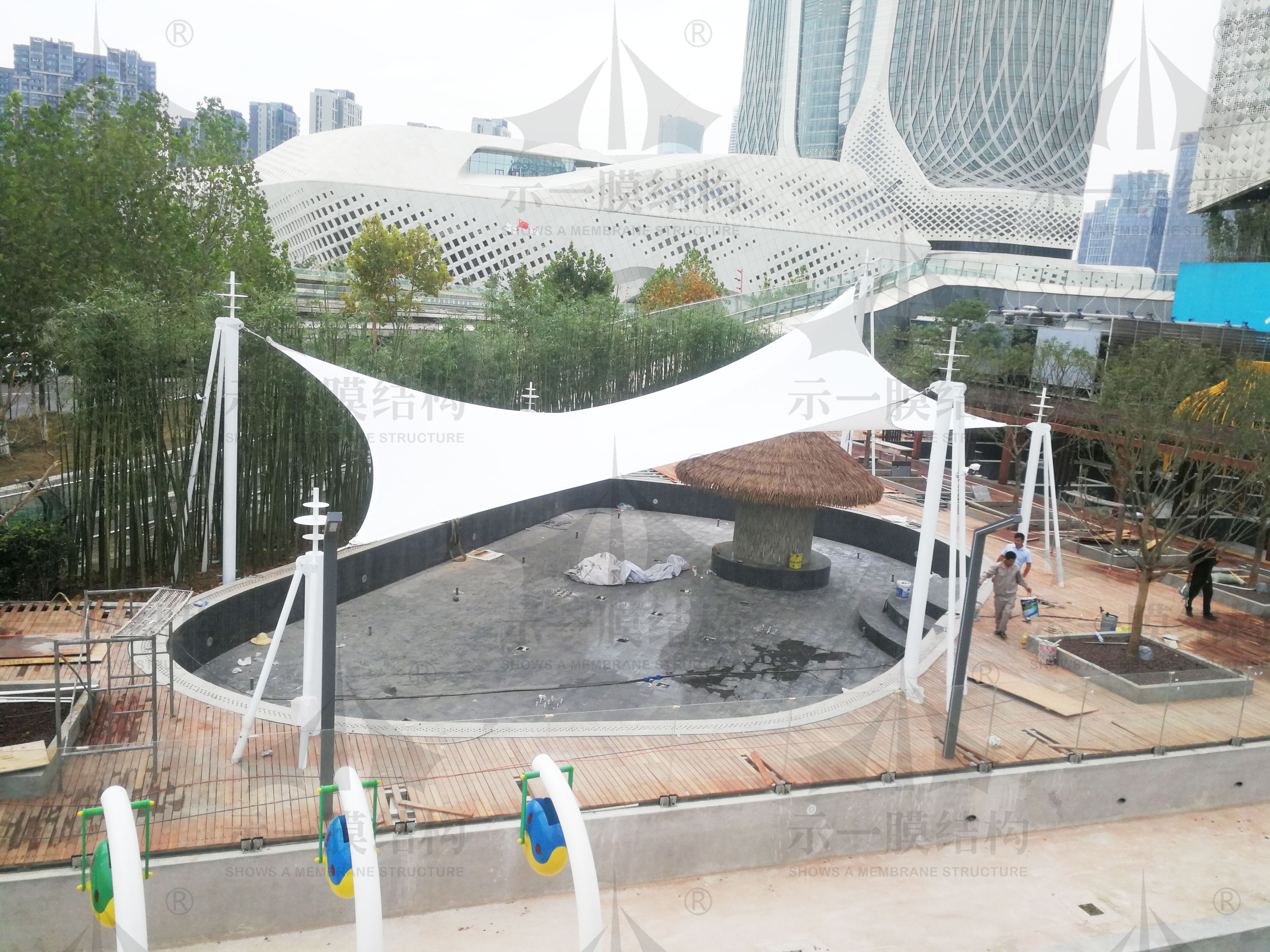 休閑遮陽棚膜結構應用于公園、社區(qū)、露天茶館或咖啡館、私家庭院等場所,并具備景觀標識作用。遮陽棚膜結構設計簡潔時尚、造型百變,其中傘形遮陽傘最為常見,膜結構遮陽傘常用的膜材有PVC及PTFE兩大類,這兩種材料均具有防火難燃、強度高、耐久性好、不受紫外線影響,使用壽命長等優(yōu)良性能。