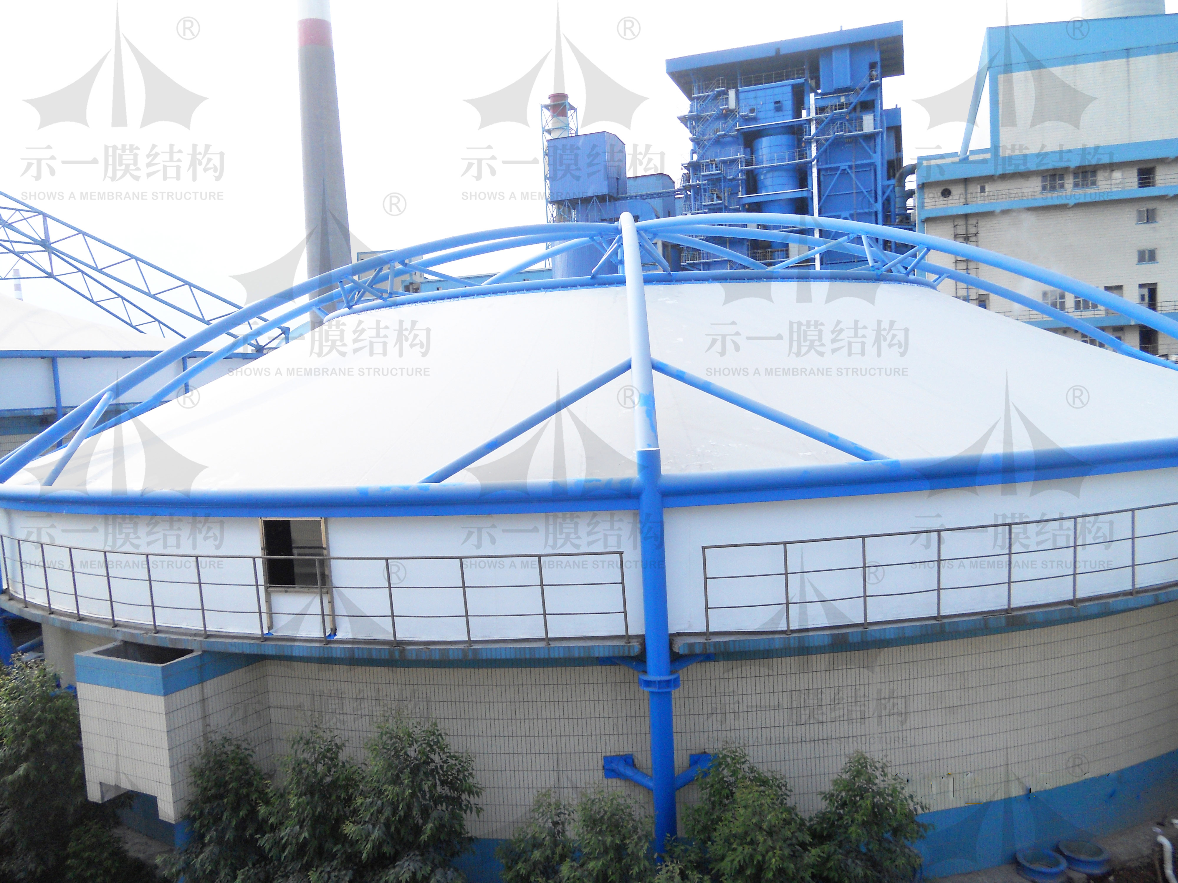 膜結(jié)構(gòu)的主要結(jié)構(gòu)形式為反吊,與臭氣的直接接觸面為耐酸耐腐蝕的高強(qiáng)度纖膜材料,使用年限都在20年以上,鋼材更是能達(dá)到50年,中間幾乎不用任何維護(hù)。