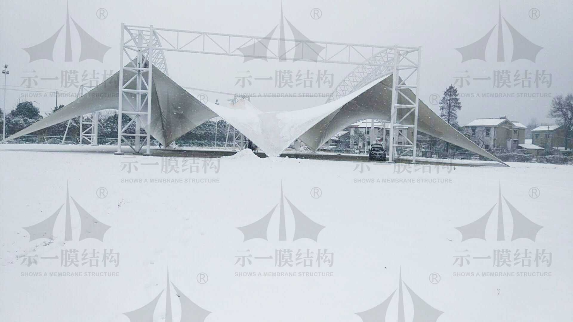 冬天連續(xù)的下雪就會(huì)產(chǎn)生積雪,有時(shí)候是連續(xù)的雨夾雪天氣,就會(huì)造成結(jié)冰現(xiàn)象。在雪災(zāi)天氣中膜面會(huì)產(chǎn)生大量積雪并發(fā)生破壞,膜材料超負(fù)荷而使抗拉能力降低,從而給膜結(jié)構(gòu)帶來(lái)很大的危害。那么膜結(jié)構(gòu)在開(kāi)始設(shè)計(jì)的時(shí)候要先針對(duì)實(shí)際面臨的問(wèn)題進(jìn)行分析和考量。通常我們對(duì)長(zhǎng)時(shí)間積雪的結(jié)構(gòu)采用的是融雪措施或是采用高強(qiáng)度膜材。