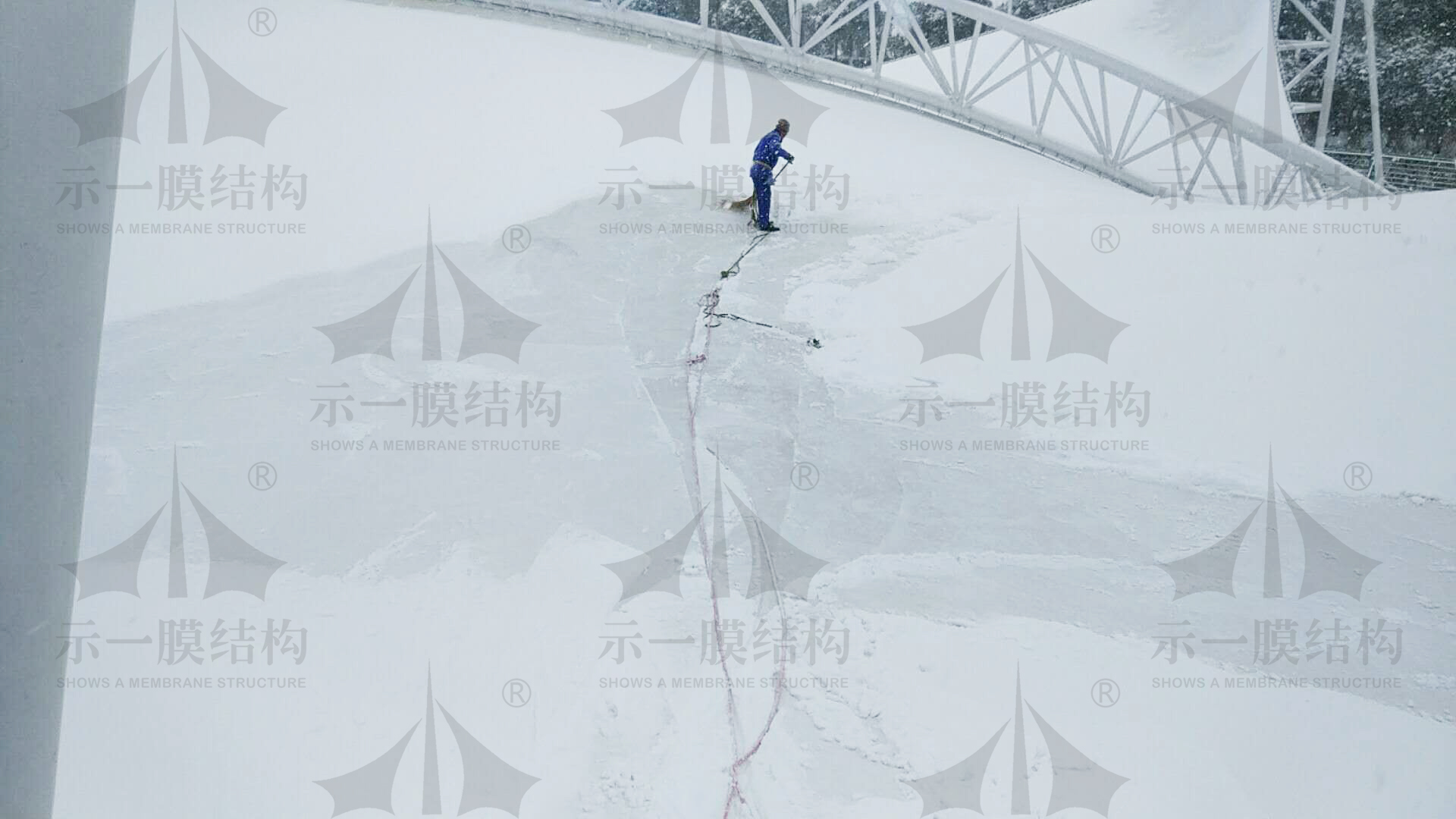 為了避免積雪現(xiàn)象引發(fā)的事故,通常會(huì)在膜結(jié)構(gòu)建筑物的外周設(shè)置堆雪平臺(tái)以存放滑落的積雪,目前國(guó)內(nèi)一般采用人工除雪。另外可考慮在積雪最嚴(yán)重的局部位置設(shè)置加熱裝置,膜面加熱裝置可用來(lái)加速降雪期間冰雪的融化。