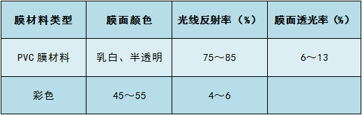 4. PVC膜材料的顏色、光線反射與透光率宜滿足下表的要求: