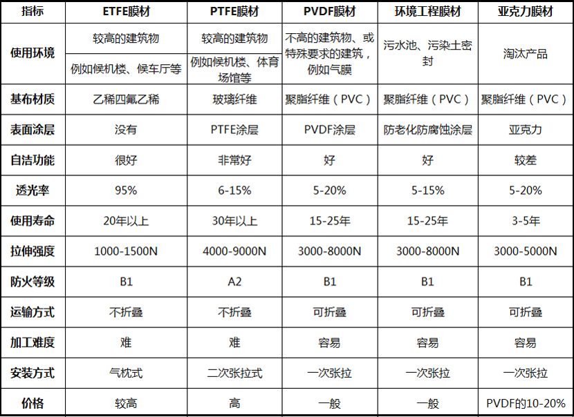 膜材對比表