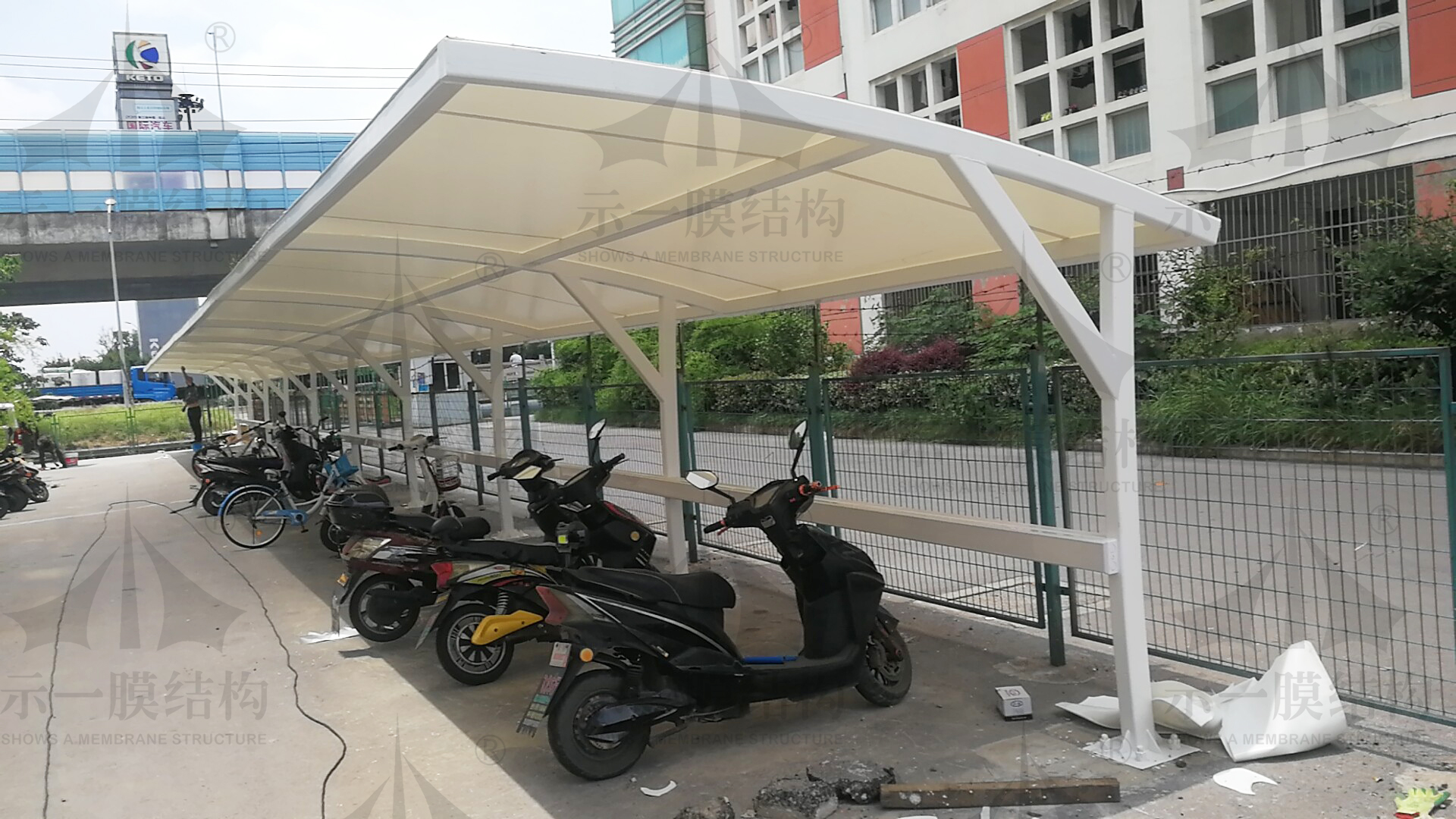 2.造型設(shè)計的區(qū)別:彩鋼板車棚結(jié)構(gòu)構(gòu)成簡單,僅為不同類型的圓管;膜結(jié)構(gòu)車棚的造型具有設(shè)計性,可制作滿足當前區(qū)域環(huán)境的車棚樣式。