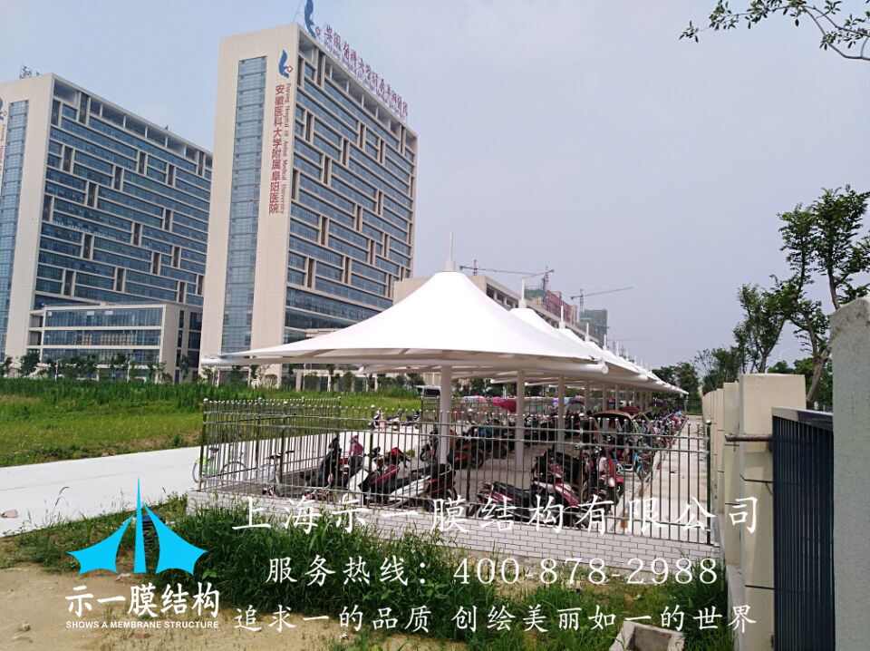 膜結(jié)構(gòu)車(chē)棚屹立在安徽醫(yī)科大學(xué)附屬阜陽(yáng)醫(yī)院里,在您去那兒看病的時(shí)候,都能看到像一個(gè)默默地平安小衛(wèi)士為您的愛(ài)車(chē)遮風(fēng)擋雨;在您看病探病的過(guò)程中,不會(huì)再因?yàn)閻?ài)車(chē)無(wú)法整齊的停放發(fā)生碰撞而發(fā)愁,也不會(huì)再擔(dān)心下雨時(shí)在外的愛(ài)車(chē)淋濕而生銹。