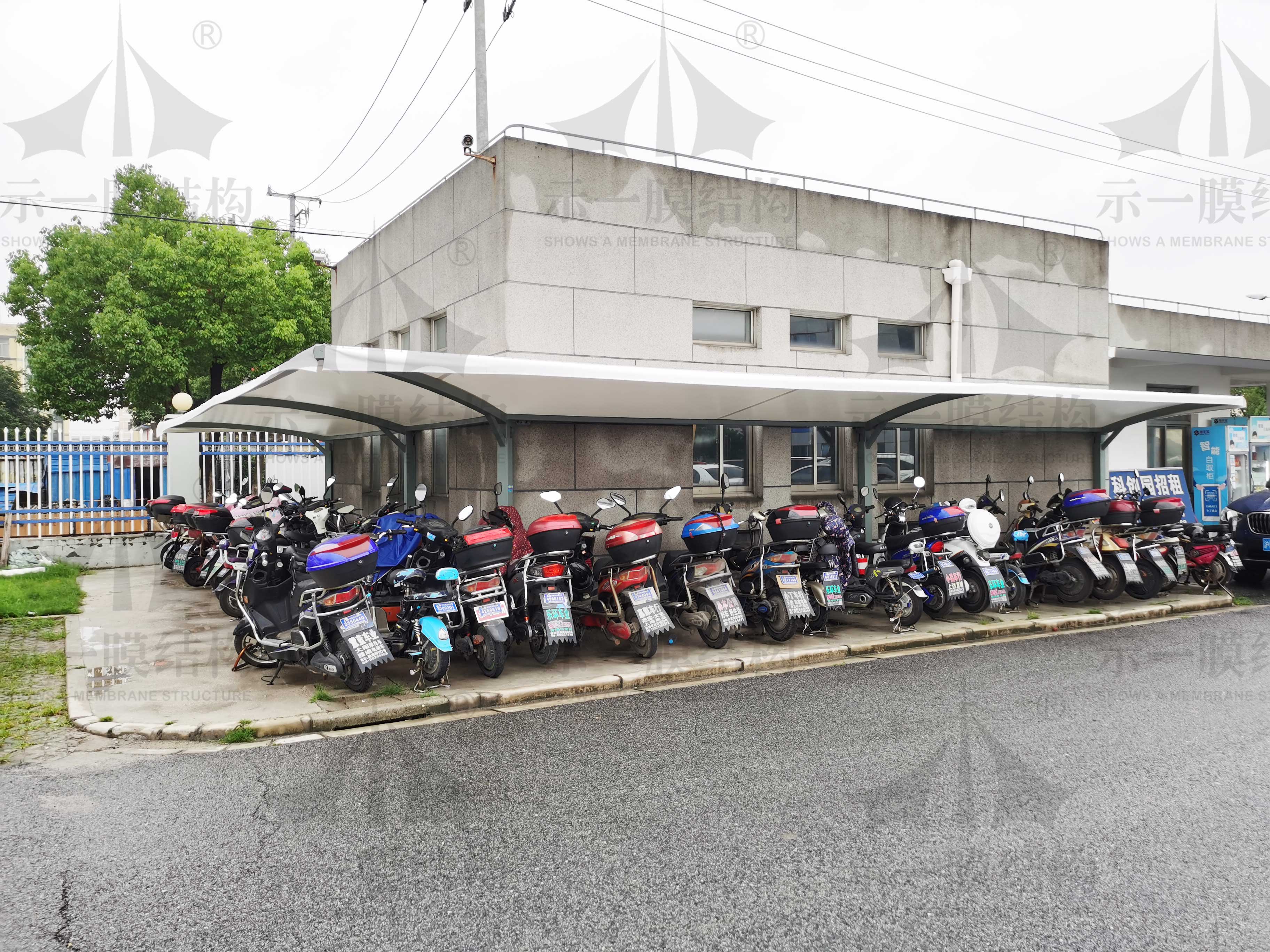 上海示一膜結(jié)構(gòu)有限公司的辦事處位于上海市青浦區(qū)竹盈路浪潮科技園內(nèi),而我們這次要介紹的膜結(jié)構(gòu)車棚就在那里。這是一個(gè)有三邊組合而成的膜結(jié)構(gòu)停車棚,這個(gè)膜結(jié)構(gòu)停車棚不是很大,造型簡單,只可以停電瓶車、自行車但在實(shí)用性上非常高,很好的解決了在園區(qū)上班非機(jī)動車停車?yán)щy的問題。