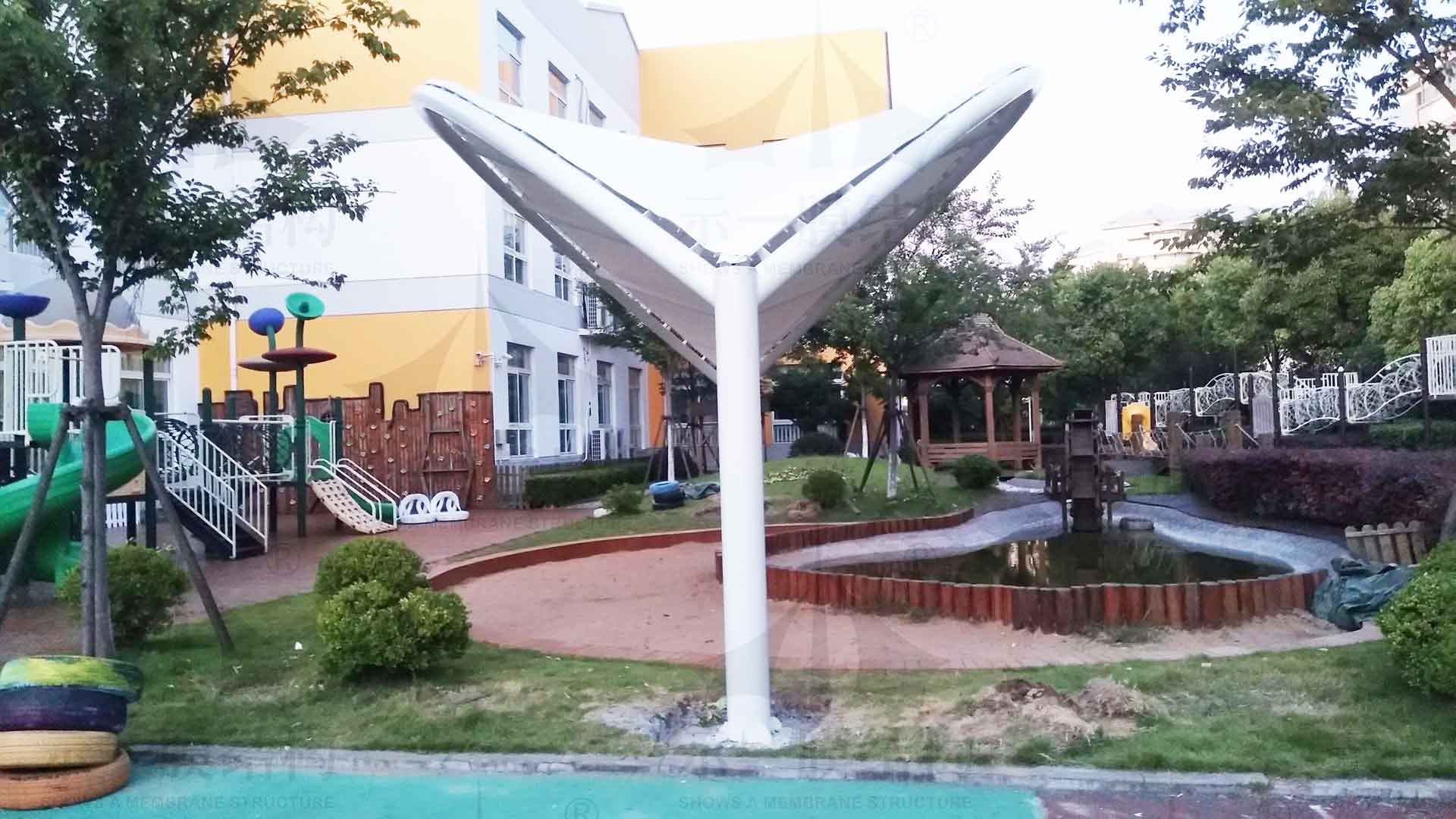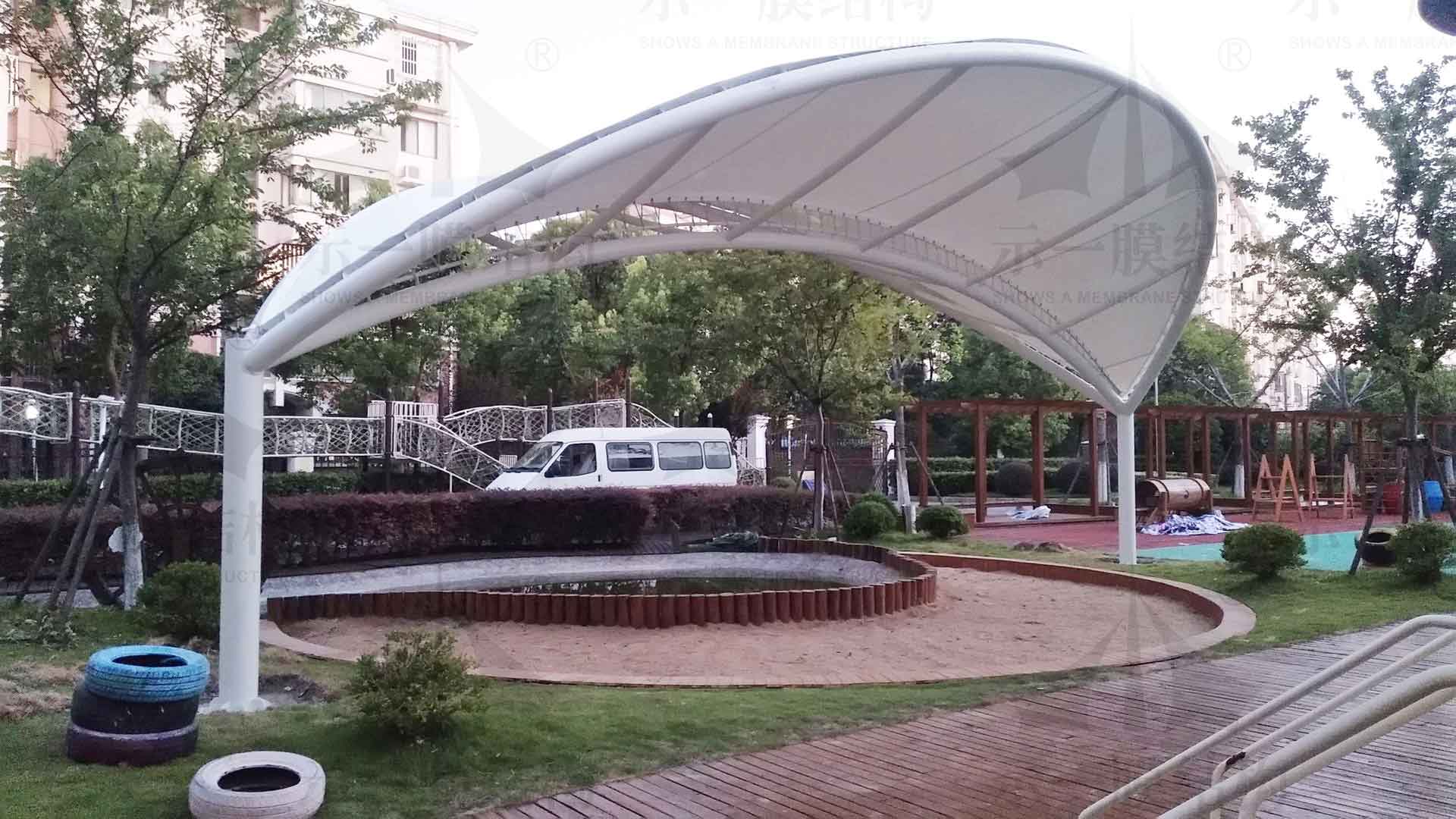校園沙坑上搭建的景觀膜結(jié)構(gòu)遮陽(yáng)棚,配以冒頂遮陽(yáng)張拉膜形式組合而成,堪稱完美組合。