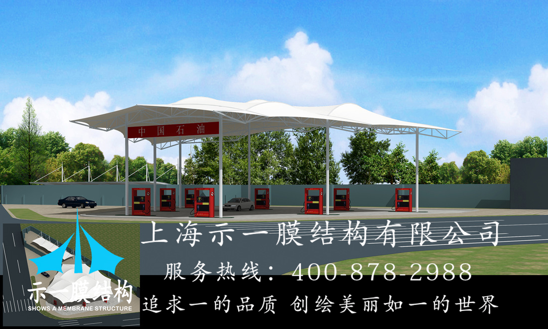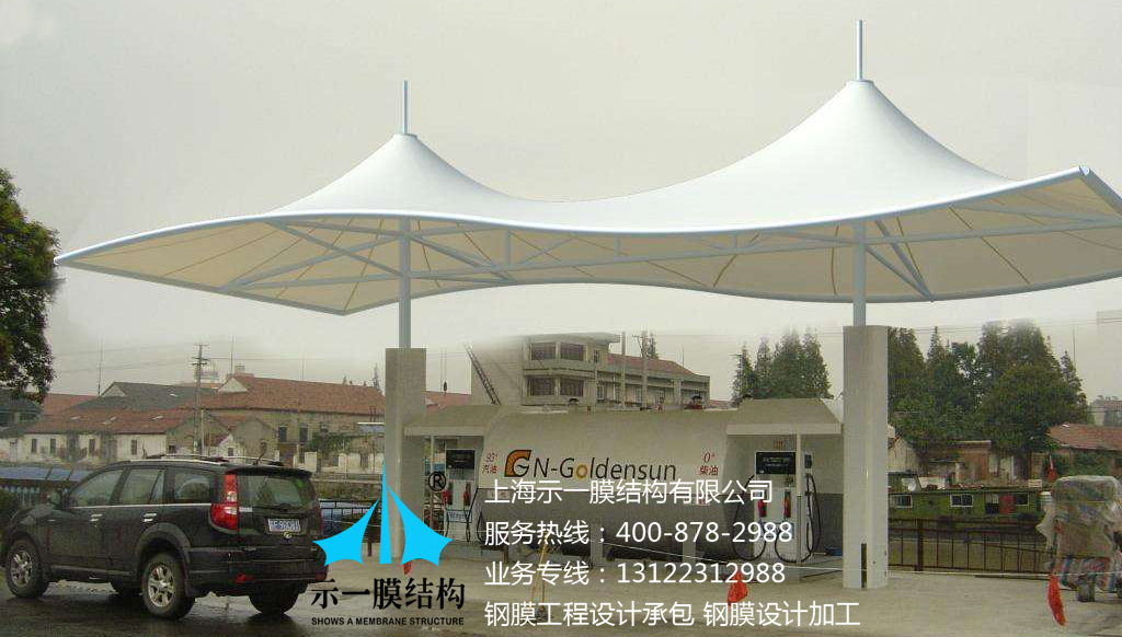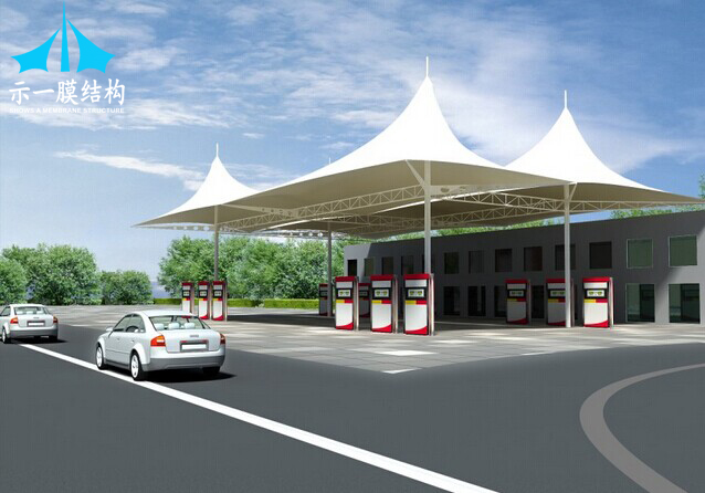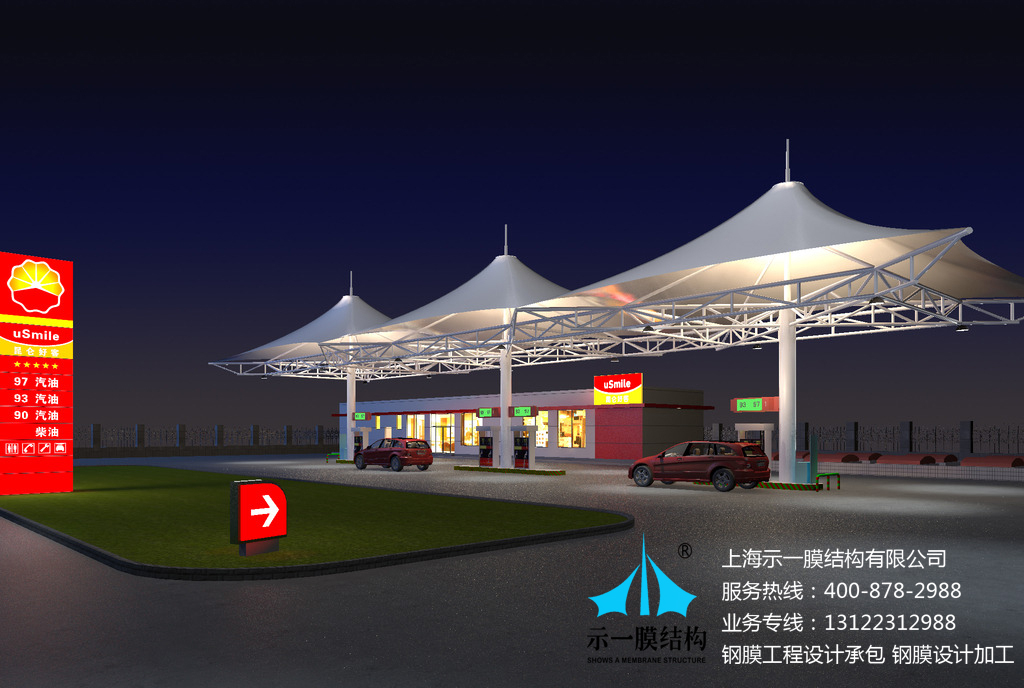 加油站廣場空間跨度大,屬于開放空間,運用鋼膜材料來設(shè)計建造十分可取。通過膜材料結(jié)合鋼柱支撐的膜結(jié)構(gòu)能使加油站整體環(huán)境起到美化作用。膜結(jié)構(gòu)材料具備功能上的諸多優(yōu)點,是非常值得推廣使用的建筑結(jié)構(gòu)形式,相信不久的將來,加油站膜結(jié)構(gòu)頂棚會越來越常見。