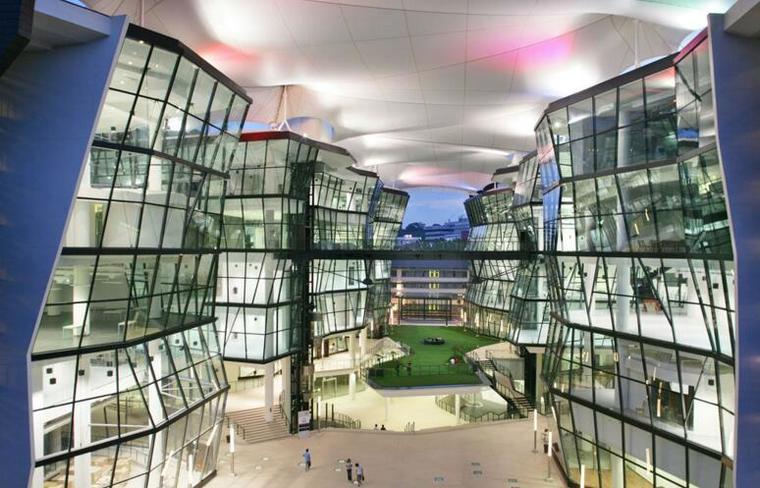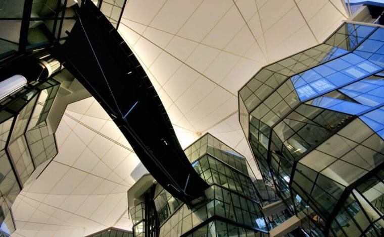 屋頂膜結(jié)構(gòu)就像一個(gè)大大的保護(hù)網(wǎng),可以遮陽(yáng),可以擋雨,膜結(jié)構(gòu)特有的柔和感和透光度又不會(huì)使空間太黑暗。新加坡拉薩爾藝術(shù)學(xué)院一大特色是富有創(chuàng)造性的屋頂膜結(jié)構(gòu),這個(gè)大跨度屋頂完美無(wú)缺的覆蓋在建筑上方,織物膜材的肌理線條與建筑相吻合,在光照映襯下,似變幻流動(dòng)的云彩,整個(gè)建筑宛如一件栩栩如生的雕塑品,又可以作為宏偉的城市地標(biāo)性建筑。