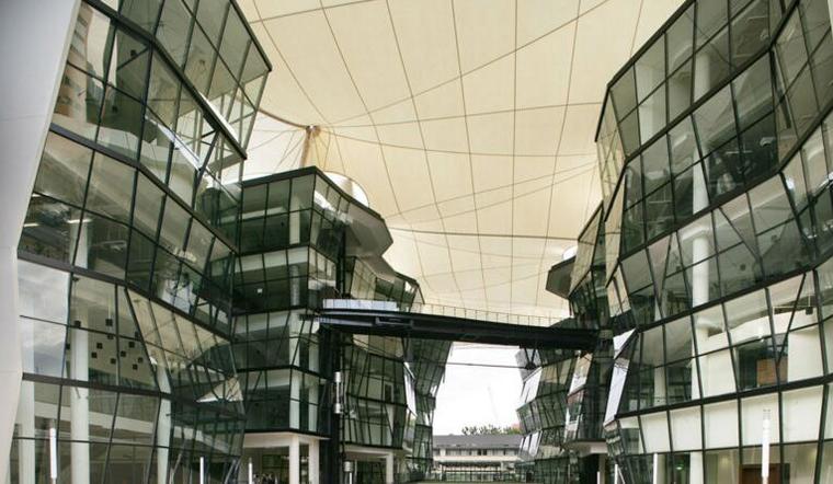該學(xué)院作為國(guó)際競(jìng)標(biāo)的一個(gè)項(xiàng)目,建筑自身成為了藝術(shù)設(shè)計(jì)的一部分,設(shè)計(jì)師將其打造成一個(gè)大體量的“黑箱子”,使得建筑內(nèi)部的一切都向外翻轉(zhuǎn),墻體上的窗洞最大程度地將校園景觀和街景滲透到室內(nèi),室外的面板則是由石料和鋁合金打造的。建筑之間通過(guò)中庭和天橋彼此形成統(tǒng)一的整體。