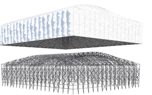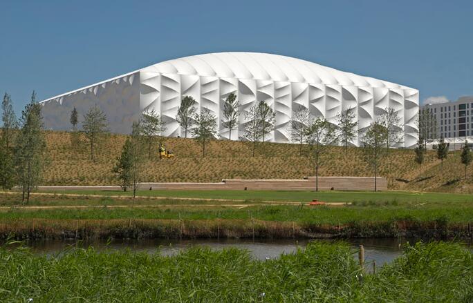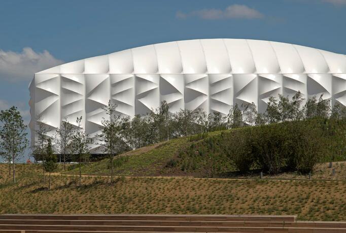 在可持續(xù)性思想的指導(dǎo)下,這個世界一流場館的膜結(jié)構(gòu)可以方便的組合,拆卸,回收,再利用。創(chuàng)新的經(jīng)濟(jì)方案讓簡單輕巧的建筑構(gòu)件代替以往的混凝土結(jié)構(gòu),場館只用了短短的6周時間便安裝完畢。場館高30m,面積兩萬平方米,外敷可回收PVC膜,膜在后面的結(jié)構(gòu)的作用下形成優(yōu)美的起伏。透光的外表皮可以使得場館在白天可以非常少的依賴人工照明。同時建筑師和燈光藝術(shù)家還合作了一個夜間燈光動態(tài)照明項(xiàng)目,燈光照在白色的膜上形成讓人眼花繚亂的效果,這個燈光安裝也是奧林匹克公園最大的燈光安置項(xiàng)目。