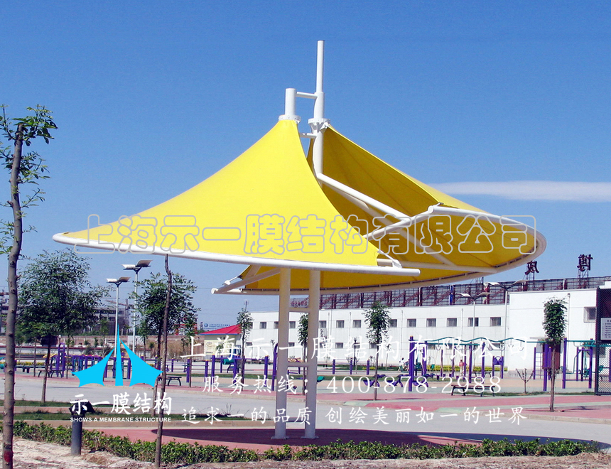 4.應(yīng)盡量避免環(huán)境中出現(xiàn)與環(huán)境不協(xié)調(diào)的景觀膜結(jié)構(gòu)。制造景觀膜結(jié)構(gòu)的材料有鋼結(jié)構(gòu)、膜材料、鋼構(gòu)件、預(yù)制混凝土、配件等,大部分景觀膜結(jié)構(gòu)的膜材質(zhì)在環(huán)境中幾乎都能夠適用。不過(guò)其不同材質(zhì)厚度放置在與之相適應(yīng)的環(huán)境中。