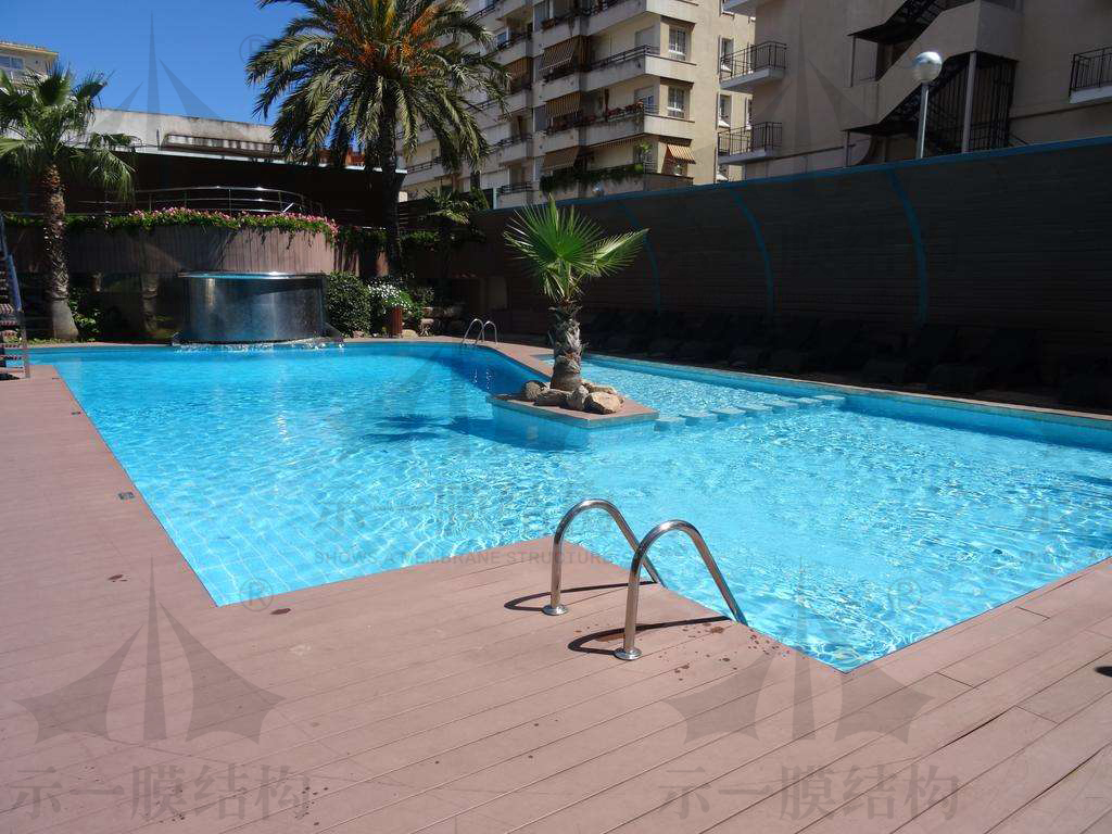 臺風(fēng)過后,天氣又異常的炎熱,大暑來了。這么大的太陽你不耶嗎?耶,耶不耶?耶,耶不耶?耶耶耶耶耶!這個(gè)時(shí)候想到的就是玩水,游泳,泡在泳池里,那是有多舒服呢!  這也是一個(gè)消暑的好辦法了。國內(nèi)很多大型的游泳池都是室外的,所以要去的話,必須做好被頂著烈日冒著被曬黑的心里準(zhǔn)備,或是不停的涂防曬霜。愛美的女士們?yōu)榱瞬蛔屪约簳窈冢家脟?yán)嚴(yán)實(shí)實(shí)的。那么為什么不給游泳池加上遮陽棚呢?這樣在與水親密接觸的同時(shí),也不必?fù)?dān)心曬黑和紫外線對皮膚造成的傷害了,多聰明的辦法??!